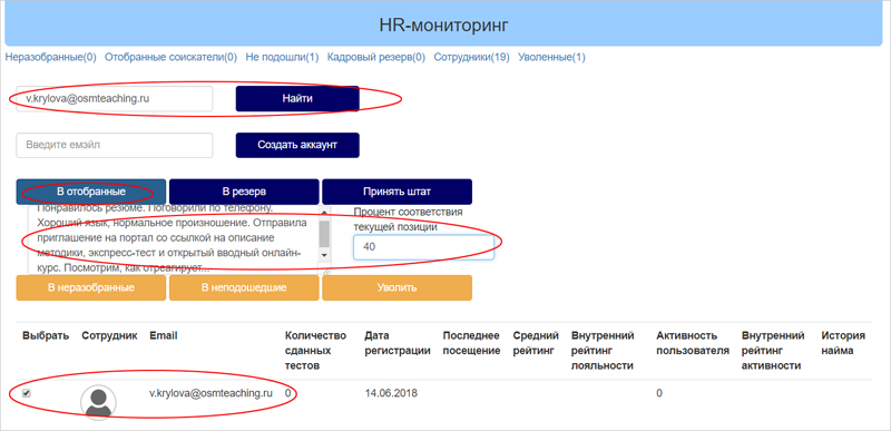 2.3. Автоматическое создание аккаунта на портале для соискателя (или нового сотрудника). Теперь не нужно просить зарегистрироваться на портале. Достаточно ввести емэйл и нажать на кнопку. Человек получит ссылку для входа на портал с автоматически созданным аккаунтом соискателя. С этого момента Вы можете передвигать аккаунт между списками отслеживания.