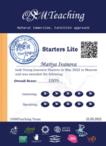 OSMTeaching Starters Lite. Экзамен уровня Pre A1 для оперешающих дошкольников. Каждый ребенок получает реестровый сертификат методического центра OSMTeaching. |